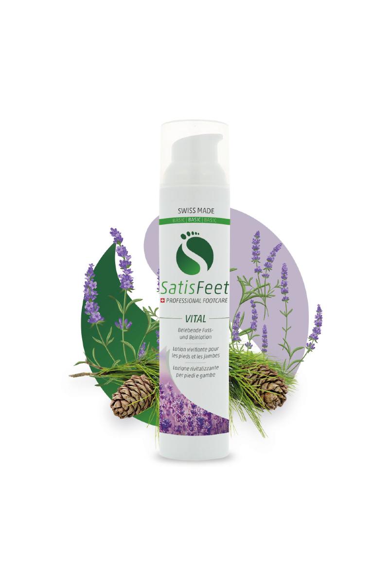 Beroligende fot og legg-lotion som trekker raskt inn og gir vitaliserte og myke ben. SatisFeet Vital passer bra for deg som står og går masse, og som opplever uro i bena. Lavendelolje fra “Mont Blanc”, gir huden et løft av vitalitet, fukt og næring.